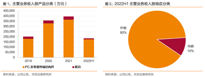 公司的主营业务为消费电子结构件模组及相关精密模具的研发、设计、生产和销售。2022H1,公司PC及智能终端结构件收入为17.54亿元,占主营业务收入的95.41%,其中金属件占比超过40%。