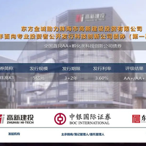 近日,东方金诚评级的“珠海市高新建设投资有限公司2023年面向专业投资者公开发行科技创新公司债券(第一期)”(以下简称“本期债券”)在证券交易所市场成功发行。本期债券发行规模为5亿元,期限为3+2年,发行利率为3.6%,为全国首只AA+孵化类科技创新公司债券。