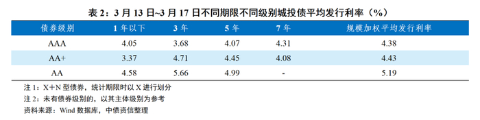发行利率:上周(3月13日~3月17日)AAA级主体发行利率较前一周上升35个BP至4.38%,AA级主体发行利率较前一周下降34个BP至5.19%,AA+级主体发行利率基本不变。整体看,上周高低级别城投债发行利率分化情况有所缓解。
