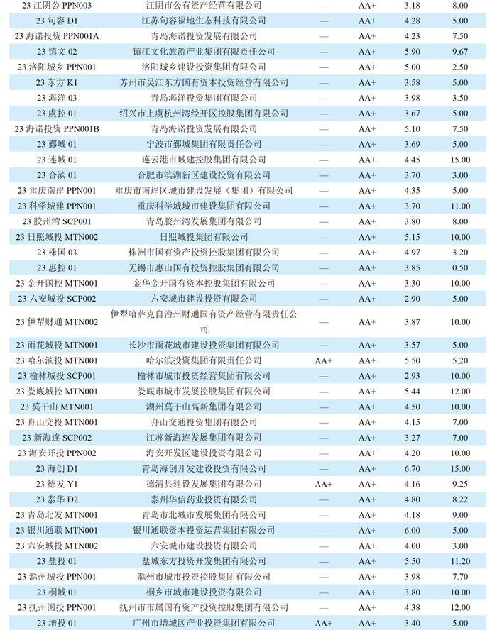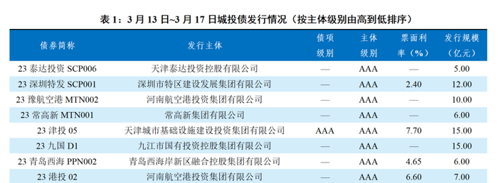 城投债发行:上周城投债发行规模基本维持不变;主体评级以AA+和AA级别为主;发债主体以市本级和园区为主;债券类型以公司债、(超)短期融资券和中期票据为主;AAA级别主体债券发行利率有所上升,AA级别主体债券发行利率有所下降。