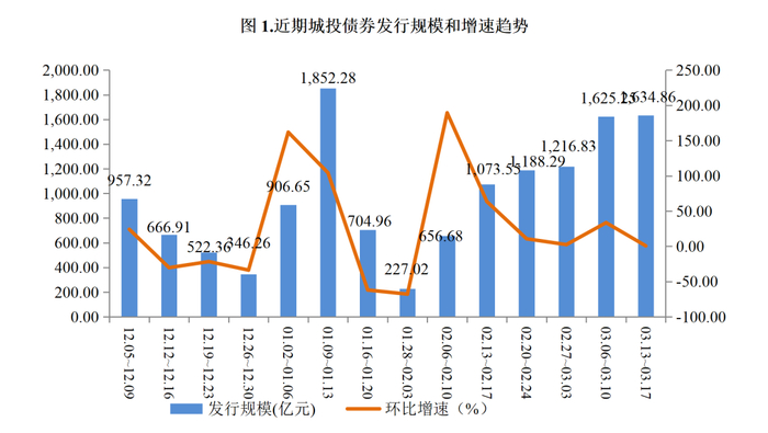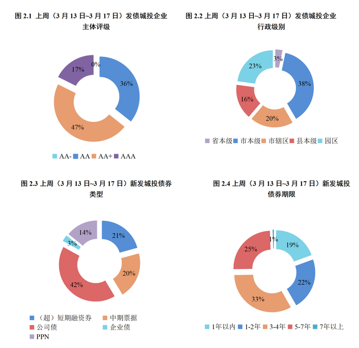 发行量:上周(3月13日~3月17日)城投债共发行245只,发行规模1,634.86亿元,较前一周基本维持不变。上周发债主体仍以市本级和园区为主,合计占比约为61.22%;主体评级以AA+和AA级别为主,AA级别占比较上一周上升2.90个百分点至35.66%。分债券类型看,上周城投债以公司债、(超)短期融资券和中期票据为主,发行规模占比分别为41.63%、20.77%和20.58%,公司债发行规模下降7.11个百分点至41.63%。债券期限方面,上周城投债发行仍以中长期限为主,3年期及以上合计占比约59%,与前一周相比无显著变化。