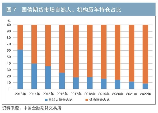 2022年,国债期货市场机构投资者占比进一步提升,成交占比为75.47%,持仓占比为91.39%,较2021年分别上升9.95、2.98个百分点,以机构投资者为主的市场结构日益巩固(见图6、图7)。
