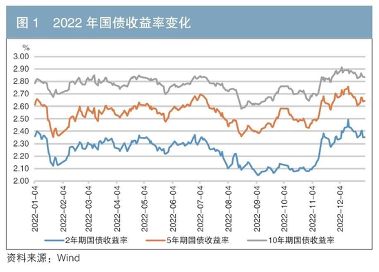 2022年初,经济下行压力加大,央行实施降息等货币政策,国债收益率呈下行走势。春节后至7月初,国债收益率窄幅震荡,整体有所上行。7至8月,超预期因素加剧了经济修复的不确定性,8月央行再度下调逆回购和中期借贷便利(MLF)利率10BP,推动债券收益率下行,10年期国债收益率于8月18日降至年内低位2.5800%。9月至年末,稳增长政策效应逐步释放,房地产行业支持政策、防疫优化措施出台,10年期国债收益率于12月6日升至年内高点2.9152%。年末,2、5、10年期国债收益率分别为2.35%、2.64%、2.84%,较年初分别下行0.73BP、上行3.19BP、上行4.98BP(见图1)。