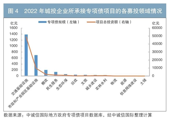 2022年以来,地方政府专项债券(以下简称“专项债”)作为积极财政政策的重要抓手,发行前置且大幅扩容,在促进基建发力、托底经济发展中发挥了重要作用。据中诚信国际统计,2022年我国共发行专项债4.03万亿元,同比增长12.46%,主要投向市政及产业园区(30%)、交通(18%)、民生服务1(17%)、棚改(11%)、农林水利(6%)等领域。城投企业作为地方基础设施建设的主力,承接专项债项目建设具有天然优势。据中诚信国际不完全统计,2022年承接专项债项目的城投企业共410家,对应专项债投资规模为2656.43亿元,涉及项目投资总额达6.43万亿元,涉及项目数量达1169个。