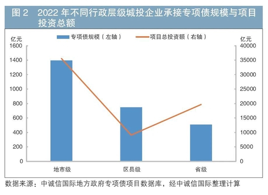 从行政层级来看,地市级城投企业承接专项债规模最大,为1397.80亿元,涉及项目总投资额达到3.56万亿元,项目数量达505个。其次是区县级,承接专项债规模为748.86亿元,涉及项目总投资额达0.91万亿元,项目数量最多,为521个。省级城投企业承接专项债规模为509.77亿元,涉及项目总投资额达1.96万亿元,项目数量为143个(见图2)。