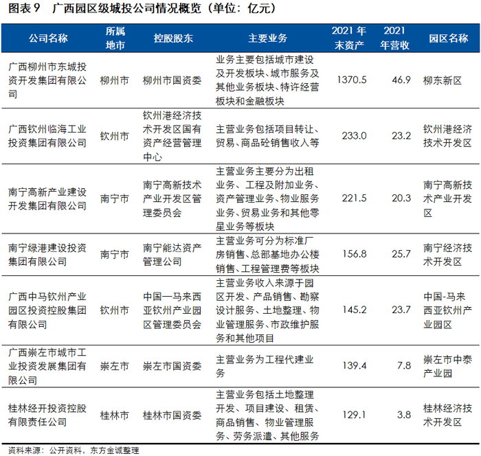 广西园区级发债城投公司较少,仅为7家,以国家级园区、中外合作产业园区为主,主要集中于产业发展水平相对较强的南宁、柳州、钦州等地市。