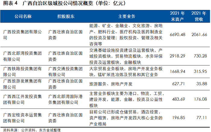 广西城投公司资产及净资产向自治区级和地市级聚集。2021年末,广西自治区级、地级城投资产总额合计占比近90%;净资产合计占比达87%。其中,广投集团资产规模远高于其他城投,2021年末资产总额高达6690.5亿元,与其他省级城投相比,规模仅低于北京国有资本运营管理有限公司、四川发展(控股)有限责任公司、天津城市基础设施建设投资集团有限公司、上海城投(集团)有限公司、云南省建设投资控股集团有限公司。广投集团的职能定位是广西最重要的产业投资和国有资产经营主体,代表自治区政府参与广西重点项目的建设、投资和经营,同时也是广西首家进入世界500强的本土企业。公司的经营范围包括对能源、矿业、金融业、文化旅游、房地产、肥料行业、医疗机构及医药制造业的投资及管理;股权投资、管理及相关咨询;国内贸易;进出口贸易等。其中广投集团在能源和铝业资源条件、区域市场竞争地位、产业链建设方面均具有很强的竞争优势,是广西地方最大的铝业和能源集团;电力方面,子公司广西广投能源集团有限公司成为区内最大的地方发电集团;燃气业务方面,子公司广西广投天然气管网有限公司是广西承接中石油入桂天然气资源的唯一主体;金融方面,广投集团持有北部湾银行、国海证券、广西金融投资集团有限公司等金融公司股份,业务涉及银行、证券、财险、小额贷款及融资租赁等业务;医药医疗业务方面,广投集团持有上市公司广西梧州中恒集团股份有限公司股份。
