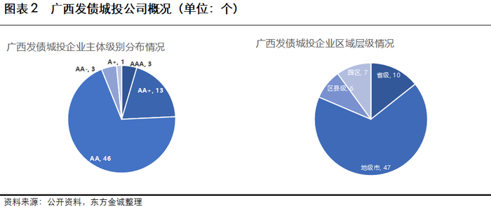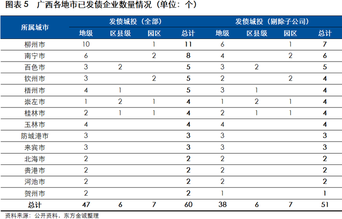 广西已发债的地级城投公司共47家,剔除发债城投子公司为38家,柳州市、南宁市数量较多,其余地市也均有已发债城投公司。