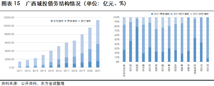 广西城投融资结构上以银行融资为主,债券融资方式较难下沉到弱地市及区县级;非标融资占比虽有压降,但水平仍很高