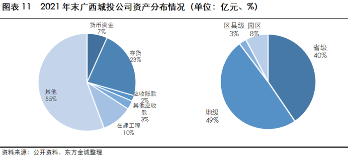 自治区级城投资产规模高,业务多元化程度强;柳州市、南宁市城投公司数量较多,规模较大;区县级、园区级城投在资本市场上亮相较少