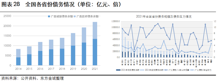 从存量角度来看,广西2021年的地方政府债务余额为8560.71亿元,在全国排名第20位;同时广西2021年末发债城投平台有息债务规模为1.34万亿元,在全国排名第15位;广西2021年的广义债务余额合计为2.55万亿元,在全国排名第18位,总体债务规模属于中游水平。