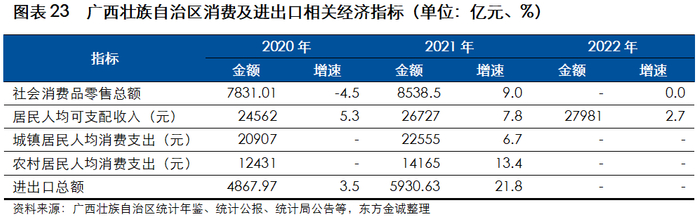 广西拥有着丰富的旅游资源和便利的交通条件,旅游业的繁荣拉动了全区住宿餐饮业、批发零售业等行业的发展,消费成为经济增长的重要动力,有力支撑了广西经济的发展。2020年,由于住宿餐饮业、批发零售业、旅游业受新冠疫情冲击较大,广西社会消费品零售总额有所下降;2021年随着新冠疫情得到有效控制,广西各地开展丰富多元的促消费活动,有效带动消费回暖;但2022年后半年新冠疫情对广西冲击较大,全年社会消费品零售总额零增长。2020年以来广西居民人均可支配收入逐年提高,带动了居民人均消费支出的增长。