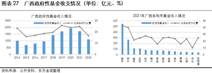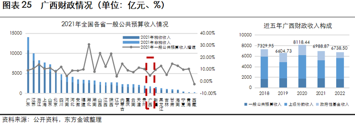 2020年以来,受疫情、减税降费、房地产市场低迷等因素影响,广西财政收入规模逐年萎缩,产业不景气导致自身造血能力不足;非税收入及政府性基金收入占比较高的结构使得广西面对房地产及土地市场景气度下滑时存在一定的财政压力
