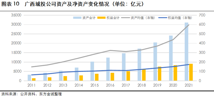 近年来,广西城投公司资产总额及均值保持较快增长,但其增长主要为负债驱动,净资产增速相对趋缓,2021年末平均资产负债率增加至71%,较上年末提升了5个百分点。