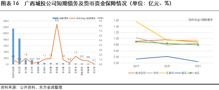 广西自治区级及柳州市短期债务规模体量相对巨大,占比达76%,货币资金短债比不足1,面临一定的短期偿债压力;桂林市货币资金充裕,对短期有息债务保障程度较好