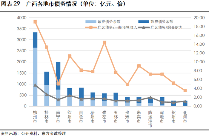 广西广义债务/综合财力全国排名14,总体债务压力较大;其中,柳州市债务压力较大;桂林、钦州、崇左市城投公司债务率水平相对较高;此外需关注贵港市城投公司的流动性情况
