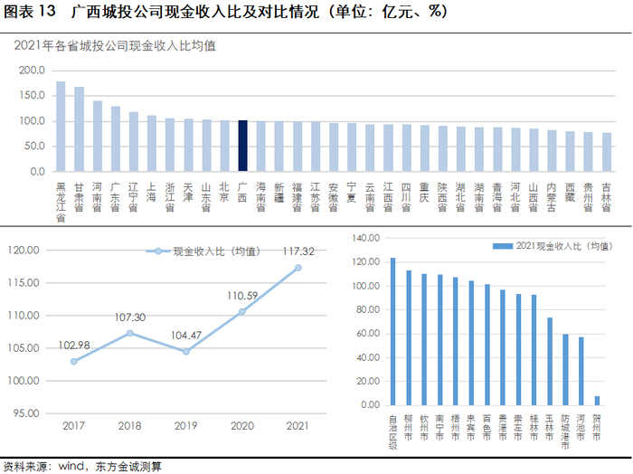近年来,广西城投公司现金收入比相对较高,处于全国中上游,主营业务整体收现情况尚可。分区域看,贵港市、崇左市、防城港市、贺州市城投公司现金收入较低,均在80%以下,其中贺州市仅为7.88%,当地城投企业收入回款情况有待改善。