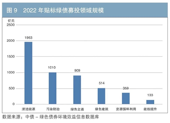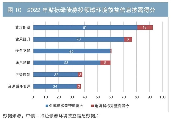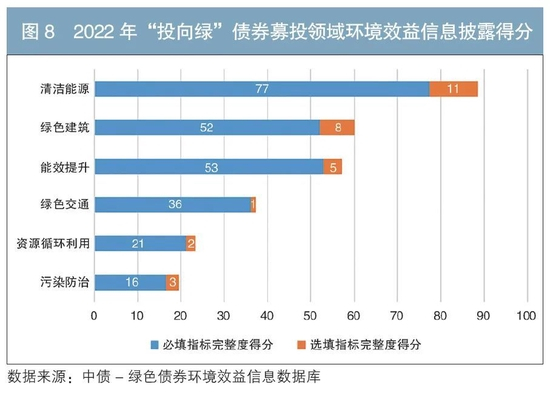 2022年公开发行的贴标绿债的募投项目主要集中于清洁能源、污染防治、绿色交通等领域(见图9),其中环境效益信息披露完整度得分最高的行业依次为清洁能源、能效提升和绿色交通(见图10)。
