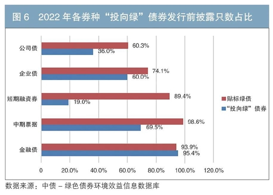 参考中债绿色指标体系,根据中债-绿色债券环境效益信息数据库(以下简称“中债绿债数据库”)的绿债发行前环境效益信息数据统计,2022年我国公开发行“投向绿”债券964只,在发行前阶段披露环境效益信息的有514只,披露只数占比8为53.3%。公开发行贴标绿债391只,在发行前阶段披露环境效益信息的有331只,披露只数占比为84.7%。在“投向绿”债券中,金融债的披露只数占比最高,达95%;中期票据、企业债券次之,披露只数占比均超过60%。在贴标绿债中,中期票据、金融债、短期融资券披露环境效益的只数占比较高,均达到90%左右(见图6)。