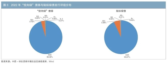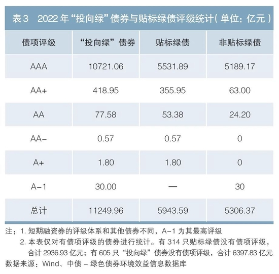 在发行评级方面,2022年新发行的“投向绿”债券和贴标绿债信用评级均较高(见表3)。