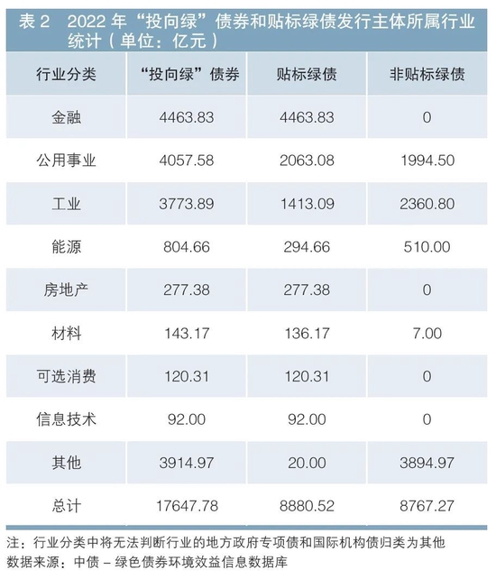 从发行主体已披露的行业分布来看,“投向绿”债券和贴标绿债均主要集中于金融、公用事业和工业等行业(见表2)。