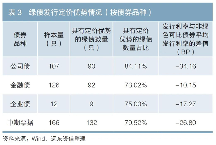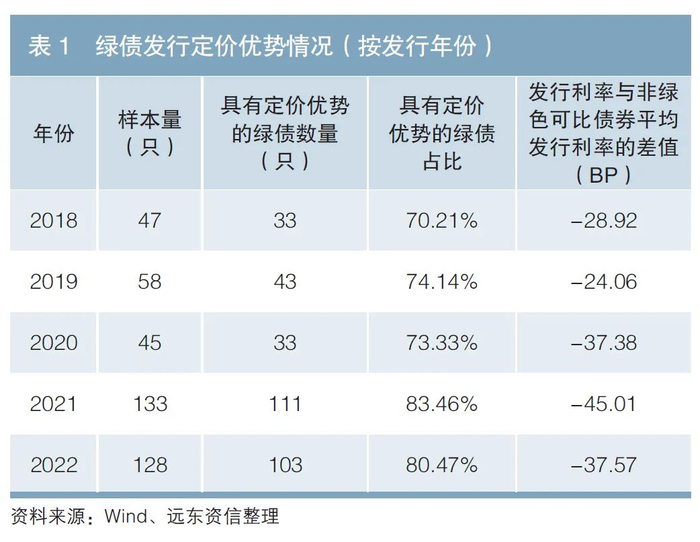 整体看,近5年具有发行定价优势的绿债占比都在70%以上;从发行年份看,随着市场对于环境因素重视程度的提高,具备发行定价优势的绿债数量占比总体呈现增加趋势(见表1)。
