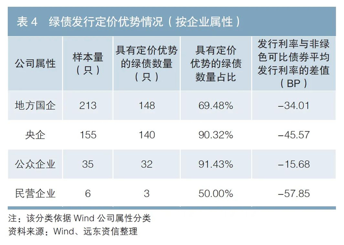从发行主体的属性看,绿债样本中占比较高的央企和公众企业具有定价优势;地方国企具有定价优势的占比则较为一般;民营企业在现阶段绿债发行量较少,在有限的6只样本债券中,仅有3只表现出了定价优势(见表4)。