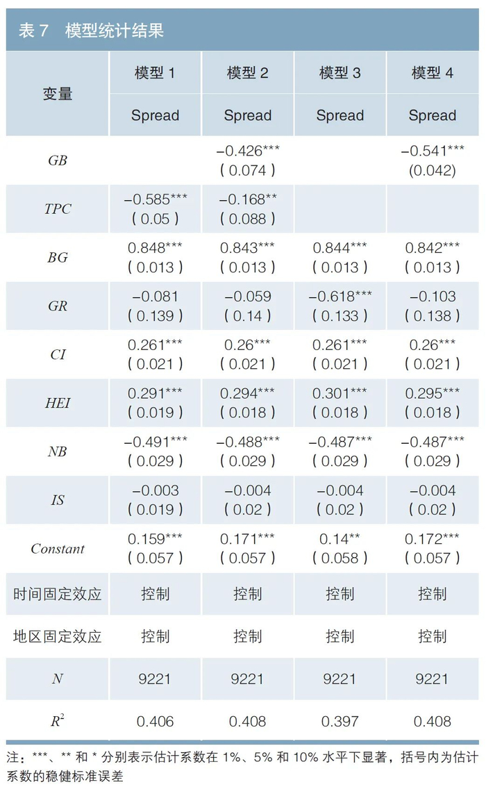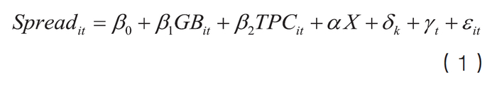 如表5所示,i代表样本中发行的第i只债券,k代表债券发行主体所在地区,t代表债券发行的年份。被解释变量Spread为债券发行利率与当天相同期限的国债到期收益率之差,用于反映债券的风险溢价。核心解释变量GBit,赋值1代表是绿债,0代表非绿债;TPCit代表绿债第三方评估认证,用于反映债券发行人是否有对绿债进行第三方评估认证的报告,1代表有,0代表没有。δk为债券发行主体所在地区固定效应,γt为时间固定效应,εit为随机扰动项。