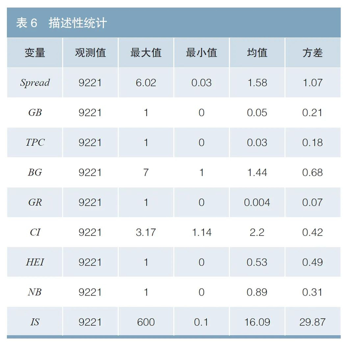 表6为本文主要变量的描述性统计结果。其中,债券的风险溢价(Spread)最小值为0.03,其大于0表明样本中的所有债券都存在着不同程度的风险溢价;高耗能行业(HEI)的均值为0.53,非常接近0.5,说明高耗能行业与低耗能行业的样本占比大体相当;债券信用评级(BG)的均值为1.44,介于信用评级符号AAA与AA+之间。