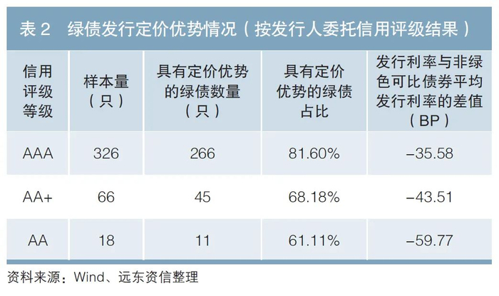 从债项信用评级看,大部分AAA级绿债具有发行定价优势,但随着债项信用级别的降低,具有定价优势的绿债数量占比逐步降低,或因低信用评级债券发行人的信用风险相对较高,对风险溢价的影响更大,部分压制环境因素驱动的定价优势(见表2)。