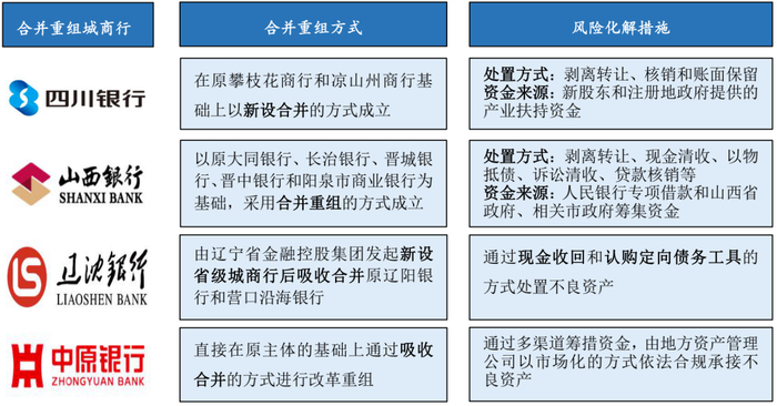 部分城商行在经历了信贷资产快速增长、通过非标投资跨区展业的高速发展的同时,也埋下了风险隐患;近年来,在宏观经济疲软、产业结构调整的大背景下,部分区域由于支柱产业受冲击较大而新兴产业支撑不足导致当地经济发展面临较大压力,从而导致地方企业经营压力大幅上升,偿债水平明显下降,风险暴露并传导至对当地企业信贷支持力度较大的城商行,而个别城商行由于前期信贷管理较为粗放导致风险管理能力不足,在内外部因素的双重影响下,其资产质量明显恶化,同时强监管使潜在风险亦露出水面;然而,中小银行对不良资产的处置方式多以自我消化为主,部分地区城商行受限于盈利较弱等因素难以化解较重的历史包袱。在此背景下,2020年7月,银保监会城市银行部副主任刘荣在银保监会通气会上表示,支持因地制宜、综合施策,积极推动深化城商行改革和化解风险,支持部分省份因地制宜对辖内城商行采取联合重组等方式,深化改革化解风险,目前有的省份辖内中小银行改革重组正在有序推进。在上述背景下,2020年以来,多个地区政府牵头推进城商行通过合并重组的方式化解金融风险,并取得一定成效,四川银行、山西银行和辽沈银行陆续成立,同时,中原银行于2022年吸收合并原洛阳银行、平顶山银行和焦作中旅银行,进一步推动了城商行的合并重组进程。这一阶段的城商行改革重组,则凸显了“化险”的主基调。