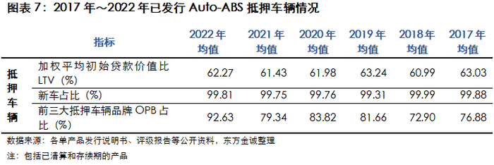 Auto-ABS产品基础资产绝大部分由借款人以汽车提供抵押担保,且抵押车辆以新车为主,加权平均初始贷款价值比(LTV)在60.00%~64.00%之间,抵押担保较充分,对产品到期兑付形成有利支撑;抵押车辆新车占比在99.00%以上。
