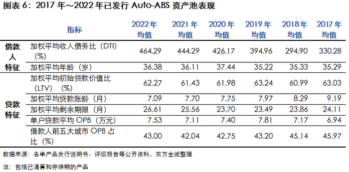 借款人的还款能力是影响基础资产违约率的重要因素,借款人的年龄、收入债务比(DTI)是判断借款人还款能力的重要指标。从各年已发行Auto-ABS来看,借款人年龄均值处在35岁左右,该年龄段借款人多处于收入稳定期,有助于其按时足额偿还贷款;Auto-ABS借款人加权平均收入债务比(DTI)均值自2018年起逐年上升,2022年均值为464.29%,较上年末进一步提升,还款能力有所提升。