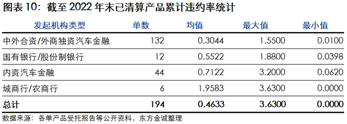 截至2022年末,按照不同发起机构,对已清算产品累计违约率均值进行统计可知,中外合资/外商独资汽车金融(0.3044%)<国有银行/股份制银行(0.5522%)<内资汽车金融(0.7122%)<城商行/农商行(1.9583%)。外商独资/中外合资汽车金融公司占据国内中高端车型市场,对应车贷借款人经济实力较强,具备更强的偿债能力;同时其车贷业务开展较早,风控体系较成熟,风控能力相对较好,而内资汽车金融公司由于业务起步较晚,风控体系也相对较弱。相较于国有银行/股份制银行,城商行/农商行主要系中低端车型,借款人偿债能力更弱,且整体风控能力较弱。