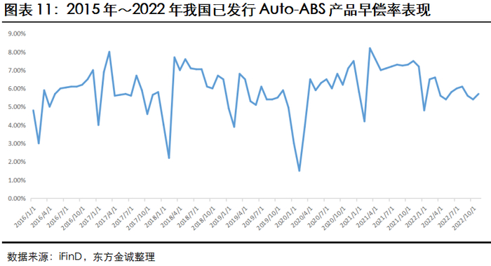 Auto-ABS产品基础资产池年化提前还款率(CPR)普遍位于5%~10%之间,整体早偿率处于较低水平;且因证券偿付以过手摊还为主,流动性风险较小