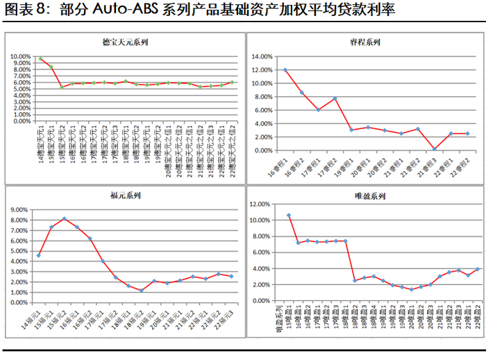 随着汽车金融公司及汽车融资租赁业务竞争加剧,预计未来Auto-ABS产品基础资产加权平均利率仍将呈现一定程度的下降,产品超额利差将有所下降,对产品的保护程度将有所下降;