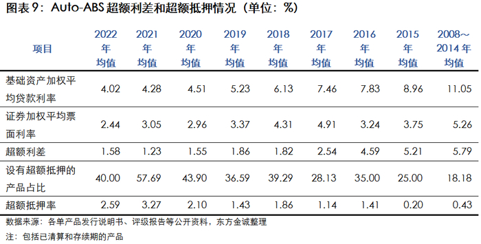 受汽车金融公司数量增加及汽车融资租赁业务的竞争等因素影响,Auto-ABS基础资产加权平均贷款利逐年下降,2022年均值为4.02%,较2021年继续下降0.26个百分点。