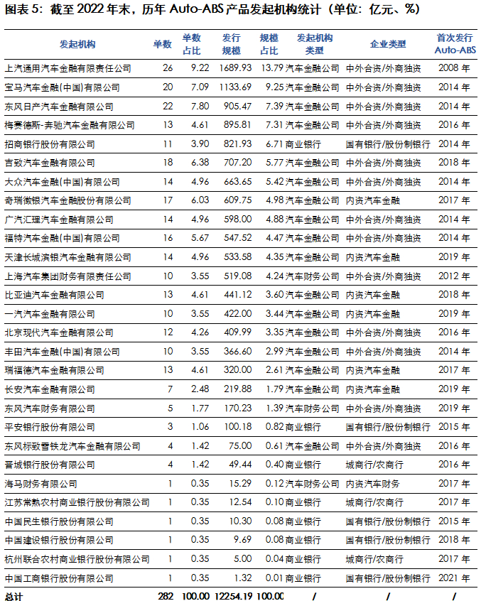 截至2022年末,市场共获批成立25家汽车金融公司,其中17家汽车金融公司已发行Auto-ABS,剩余8家汽车金融公司还未发行Auto-ABS,包括菲亚特克莱斯勒汽车金融有限责任公司、沃尔沃汽车金融(中国)有限公司、三一汽车金融有限公司、华泰汽车金融有限公司、华晨东亚汽车金融有限责任公司、上海东正汽车金融有限责任公司、山东豪沃汽车金融有限公司和裕隆汽车金融(中国)有限公司。