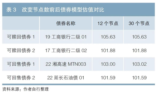 笔者进一步测试了估值结果对模型中每个时间步节点数的敏感度。将柳树模型每个时间步节点数增加至30,对比4只债券估值结果的差异程度,结果如表3所示。
