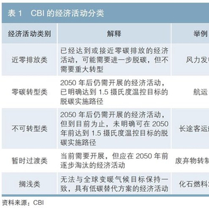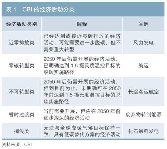2020年9月,CBI发布《为可信的转型提供融资》白皮书(以下简称“白皮书”)。CBI提出,尽管绿色债券已逐渐成为支持气候转型的重要工具,但其覆盖面有限,转型债券的推出可补充覆盖那些未得到绿色融资支持的高碳排放主体。CBI在白皮书中明确了“转型”的含义,即从目前的高温室气体排放向实现《巴黎协定》的目标进行的转型,同时提出转型的五项原则:符合1.5摄氏度温控目标的碳排放轨迹、以科学为基础设定减排目标、不计入碳抵消、技术可行性优于经济竞争性、刻不容缓的行动而非旷日累时的承诺。CBI还将转型分为实体整体的转型、经济活动的转型和减排措施三个层面,提出针对不同层面的转型应适用不同类型的金融产品。在白皮书中,CBI将经济活动分为近零排放类、零碳转型类、不可转型类、暂时过渡类、搁浅类五个类别(见表1),以此作为转型标签贴标的判断依据,并详细说明了转型标签的适用对象及使用方法。此外,CBI也提到了公正转型(Just Transition)的概念,即应在更广泛的背景下看待气候投资,注意在转型过程中保护发展的公平性,降低转型对就业、物价、能源安全等方面的负面影响。