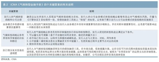 2020年12月,ICMA发布《气候转型金融手册》(以下简称《金融手册》)。其中,ICMA也将转型定义为“应对气候变化的转型”,侧重于为实现《巴黎协定》的全球温控目标提供融资支持。《金融手册》旨在为发行人的信息披露提供指引和建议,以增加这些发行人(尤其是碳密集行业发行人)在通过转型债券等方式为气候转型进行融资的可信度。《金融手册》的建议主要包括4个关键要素:发行人的气候转型战略和公司治理、业务模式中考虑环境要素的重要性、气候转型战略应参考具有科学依据的目标和路径、执行情况有关信息的透明度(见表2)。ICMA针对每个要素都给出了理据解释、信息披露建议以及独立评审、认证与验证的方法。
