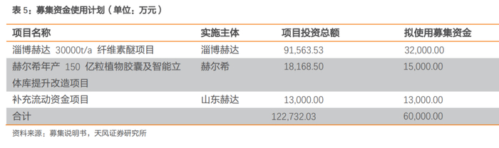 本次向不特定对象发行可转换公司债券募集资金总额(含发行费用)不超过6亿元(含本数),扣除发行费用后的募集资金用于淄博赫达30000t/a纤维素醚项目、赫尔希年产150亿粒植物胶囊及智能立体库提升改造项目、补充流动资金项目。项目从开始建设到完全达产需要4年。