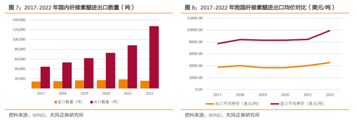 2022年,中国进口纤维素醚产品的平均单价为9945.55美元/吨,远高于出口产品平均单价4554.93美元/吨。根据募集说明书,2021年我国进出口产品均价的差异主要系进出口产品结构的不同所致。国内建材级纤维素醚已经实现国产替代,成功转向净出口,我国目前出口的纤维素醚即以建材级产品为主。医药级纤维素醚国产化水平提高,但国内外产品在品牌知名度等方面仍存在差异,医药级纤维素醚的进口需求依然存在,行业内进口纤维素醚目前以医药级产品为主,医药级纤维素醚的附加值与价格水平通常高于建材级纤维素醚,因此提高了进口纤维素醚的平均价格。