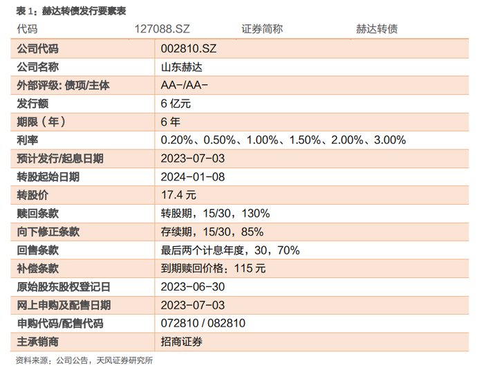 赫达转债发行规模 6 亿元,债项与主体评级为 AA-/AA-级;转股价 17.4 元,截至 2023年 6 月 29 日转股价值 101.61 元;各年票息的算术平均值为 1.37 元,到期补偿利率 15%,属于新发行转债较高水平。按2023年6月29日6年期AA-级中债企业到期收益率6.34%的贴现率计算,债底为 85.72 元,纯债价值一般。其他博弈条款均为市场化条款,若全部转股对总股本的摊薄压力为 10.07%,对流通股本的摊薄压力为 10.90%,对现有股本摊薄压力一般。