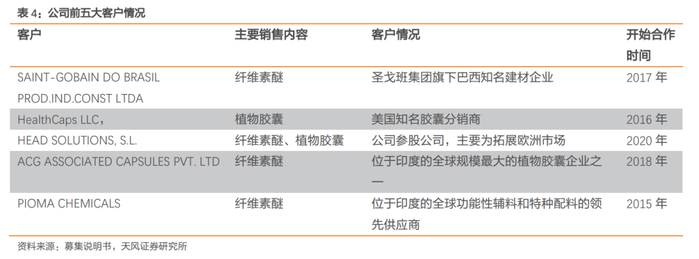 目前,公司产品已稳定销往70多个国家和地区,纤维素醚全球市占率约7-9%,植物胶囊全球市占率约8-10%。公司前五大客户均分布于海外,近三年来向前五大客户的销售收入及占营业收入的比重逐年增加,与其中四个主要客户的合作时间均达四年以上,客户资源较为稳定。