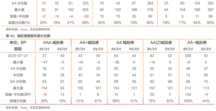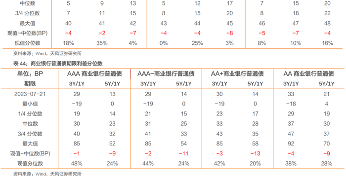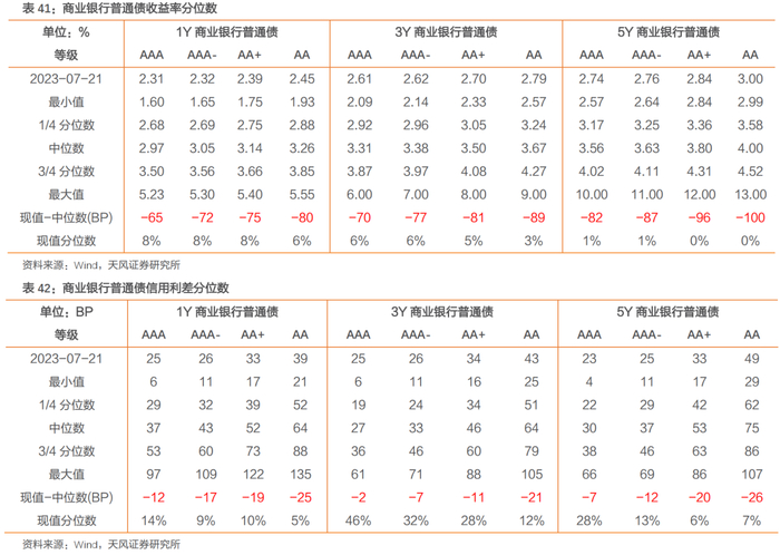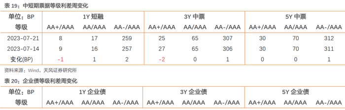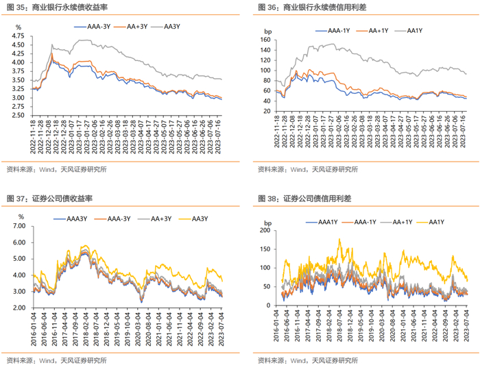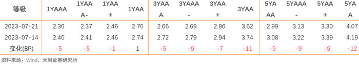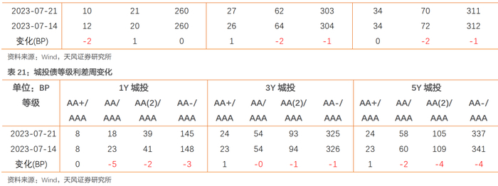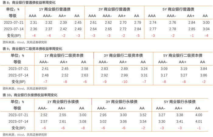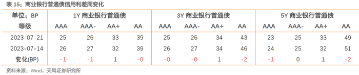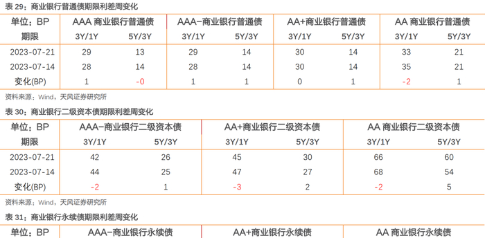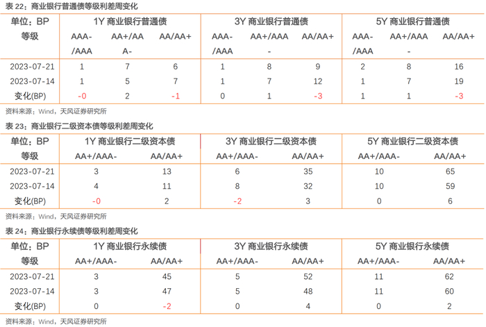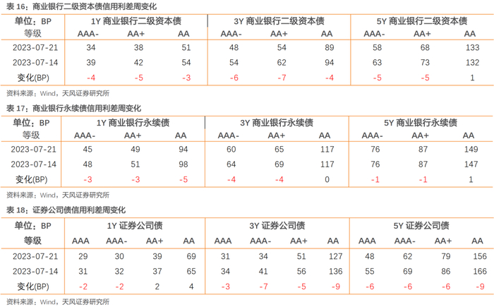 金融债期限利差部分扩大,部分缩小。具体来看,商业银行普通债收益率曲线AAA等级3Y/1Y和5Y/3Y的期限利差变动0-1BP,AAA-等级的期限利差扩大1-1BP,AA+等级的期限利差扩大0-1BP,AA等级的期限利差变动-2-1BP;商业银行二级资本债收益率曲线AAA-等级3Y/1Y和5Y/3Y的期限利差变动-2-1BP,AA+等级的期限利差变动-3-2BP,AA等级的期限利差变动-2-5BP;商业银行永续债收益率曲线AAA-等级3Y/1Y和5Y/3Y的期限利差变动-1-3BP,AA+等级的期限利差变动-1-3BP,AA等级的期限利差扩大1-5BP;证券公司债收益率曲线AAA等级3Y/1Y和5Y/3Y的期限利差缩小1-3BP,AAA-等级的期限利差变动-5-1BP,AA+等级的期限利差缩小1-7BP,AA等级的期限利差缩小0-13BP。