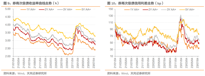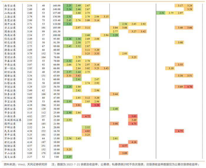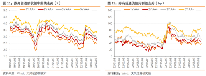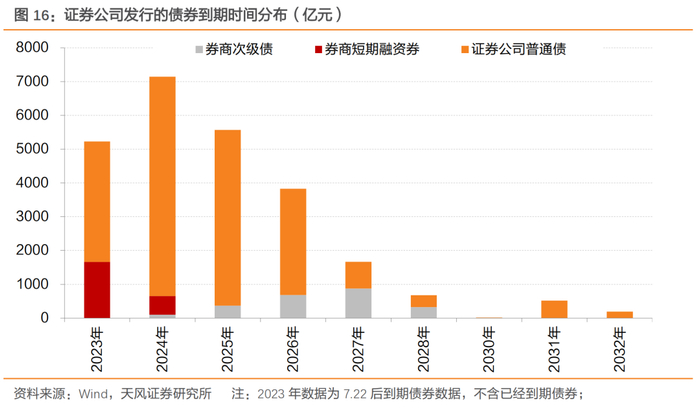 到期分布相对均匀,供给平稳。从到期时间来看,证券公司发行的次级债券到期时间较晚且比较分散,没有太大的集中到期压力;而短期融资券由于本身期限比较短,因而,到期时间主要集中在2023年和2024年;对于普通债,2023年下半年有3027.69亿元到期,到期压力稍大。考虑到当前仍面临一定的到期压力,而政策及外部环境相对平稳,下半年预计证券公司债券供给相对平稳。