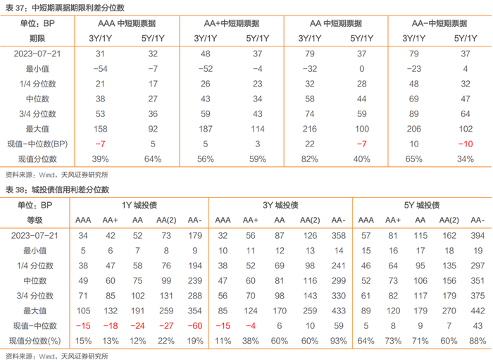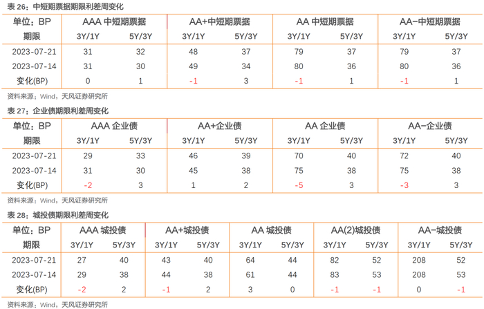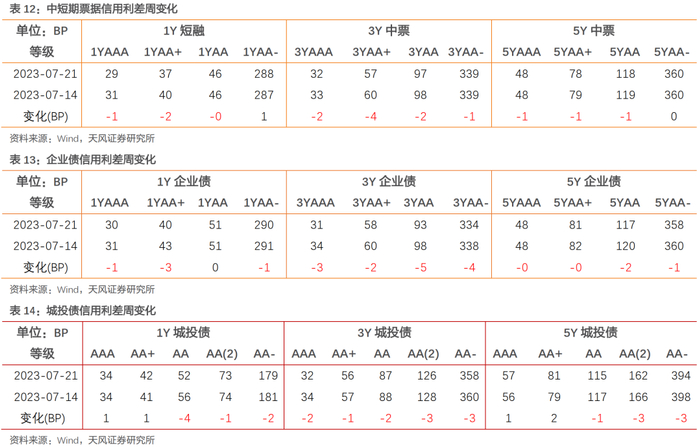 期限利差部分扩大,部分缩小。具体来看,中短期票据收益率曲线AAA等级3Y/1Y和5Y/3Y的期限利差扩大0-1BP,AA+等级的期限利差变动-1-3BP,AA等级的期限利差变动-1-1BP,AA-等级的期限利差变动-1-1BP;企业债收益率曲线AAA等级3Y/1Y和5Y/3Y的期限利差变动-2-3BP,AA+等级的期限利差扩大1-2BP,AA等级的期限利差变动-5-3BP,AA-等级的期限利差变动-3-3BP;城投债收益率曲线AAA等级3Y/1Y和5Y/3Y的期限利差变动-2-2BP,AA+等级的期限利差变动-1-2BP,AA等级的期限利差扩大0-3BP,AA(2)等级的期限利差缩小-1BP,AA-等级的期限利差变动-1-0BP。