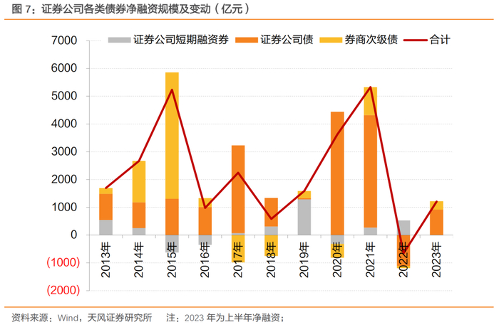 在经历了2015年的次级债发行高峰、2020-2021年的普通债发行高峰后,近两年证券公司债券净融资明显回落。2022年,证券公司债券发行规模1.1万亿,同比下滑34.3%,使得净融资回落至-661亿元。2023年上半年,证券公司债券净融资1207.4亿元,小幅回升。