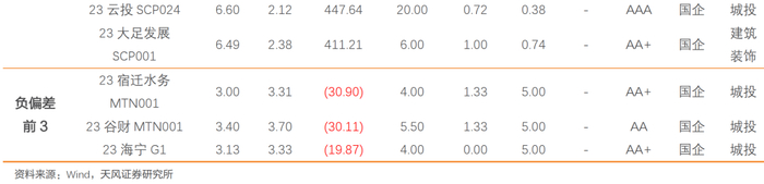本周市场参与热情较高,有投标倍数超过2倍的债券。有效投标倍数方面,0.8197年期23大丰城资CP001以7.55倍发于3.5%,为全场最高,5年期23国贸房产MTN002以2.72倍发于4.15%,位列全场第二;利率偏差方面,0.3279年期23红豆SCP003(科创票据)发行利率为7.1%,高于估值约490.15BP,0.3825年期23云投SCP024发行利率为6.6%,高于估值约447.64BP。